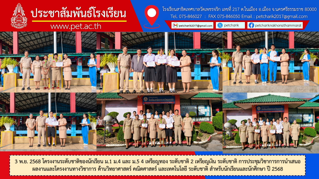 โครงงานระดับชาติของนักเรียน ม.1 ม.4 และ ม.5 4 เหรียญทอง ระดับชาติ 2 เหรียญเงิน ระดับชาติ การประชุมวิชาการการนำเสนอ ผลงานและโครงงานทางวิชาการ ด้านวิทยาศาสตร์ คณิตศาสตร์ และเทคโนโลยี ระดับชาติ สำหรับนักเรียนและนักศึกษา ปี 2568
