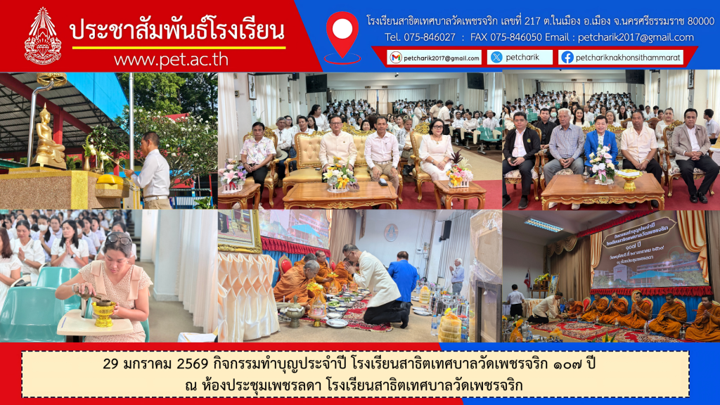 29 มกราคม 2569 กิจกรรมทำบุญประจำปี โรงเรียนสาธิตเทศบาลวัดเพชรจริก ๑๐๗ ปี ณ ห้องประชุมเพชรลดา โรงเรียนสาธิตเทศบาลวัดเพชรจริก