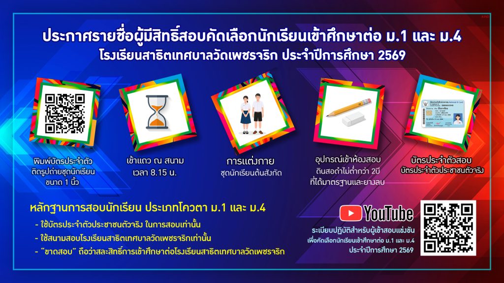 ประกาศรายชื่อผู้มีสิทธิ์สอบคัดเลือกนักเรียนเข้าศึกษาต่อ ม.1 และ ม.4 ประจำปีการศึกษา 2569