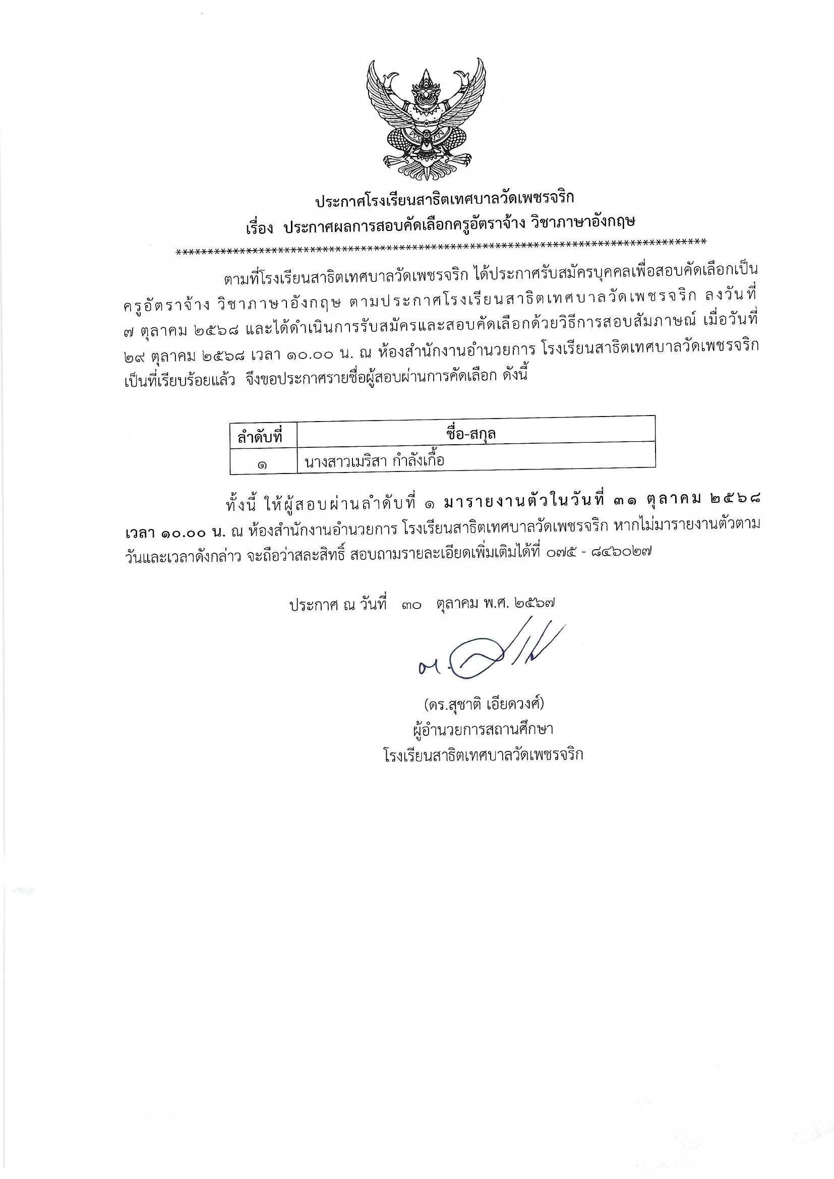 ประกาศผลการสอบคัดเลือกครูอัตราจ้างวิชาภาษาอังกฤษ