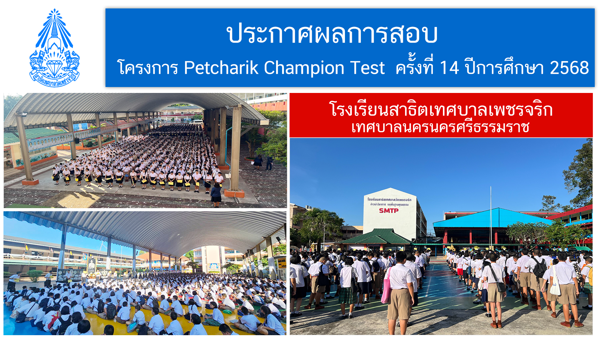 ประกาศผลการสอบแข่งขัน โครงการ Petcharik Champion Test ครั้งที่ 14 ปีการศึกษา 2568 ข่าวสารเดือนธันวาคม68 ประกาศโรงเรียน >>คลิก<< 01-บัญชีรวมทุกประเภท >>คลิก<< 02-บัญชี-ป6-โรงเรียนสังกัดเทศบาลนครนครศรีธรรมราช >>คลิก<< 03-บัญชี-ป6-โรงเรียนสังกัดอื่นๆ >>คลิก<< 04-บัญชี-ป5-ทุกสังกัด >>คลิก<<
