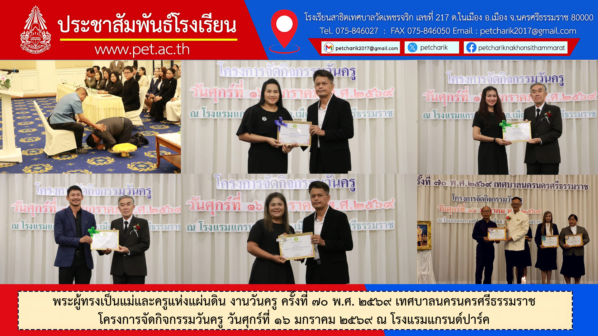 พระผู้ทรงเป็นแม่และครูแห่งแผ่นดิน งานวันครู ครั้งที่ ๗๐ พ.ศ. ๒๕๖๙ เทศบาลนครนครศรีธรรมราช โครงการจัดกิจกรรมวันครู วันศุกร์ที่ ๑๖ มกราคม ๒๕๖๙ ณ โรงแรมแกรนด์ปาร์ค ข่าวสารเดือนมกราคม69 พระผู้ทรงเป็นแม่และครูแห่งแผ่นดิน งานวันครู ครั้งที่ ๗๐ พ.ศ. ๒๕๖๙ เทศบาลนครนครศรีธรรมราช โครงการจัดกิจกรรมวันครู วันศุกร์ที่ ๑๖ มกราคม ๒๕๖๙ ณ โรงแรมแกรนด์ปาร์ค รูปกิจกรรมเพิ่มเติม : https://photos.app.goo.gl/nhmVFdzyMrRpM7Lu8