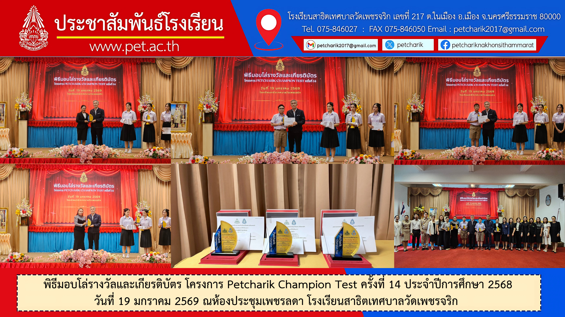 พิธีมอบโล่รางวัลและเกียรติบัตร โครงการ Petcharik Champion Test ครั้งที่ 14 ประจำปีการศึกษา 2568 วันที่ 19 มกราคม 2569 ณ ห้องประชุมเพชรลดา โรงเรียนสาธิตเทศบาลวัดเพชรจริก ข่าวสารเดือนมกราคม69 พิธีมอบโล่รางวัลและเกียรติบัตร โครงการ Petcharik Champion Test ครั้งที่ 14 ประจำปีการศึกษา 2568 วันที่ 19 มกราคม 2569 ณ ห้องประชุมเพชรลดา โรงเรียนสาธิตเทศบาลวัดเพชรจริก รูปภาพกิจกรรมเพิ่มเติม : https://photos.app.goo.gl/vHRVvDHhfyc6KK4C6