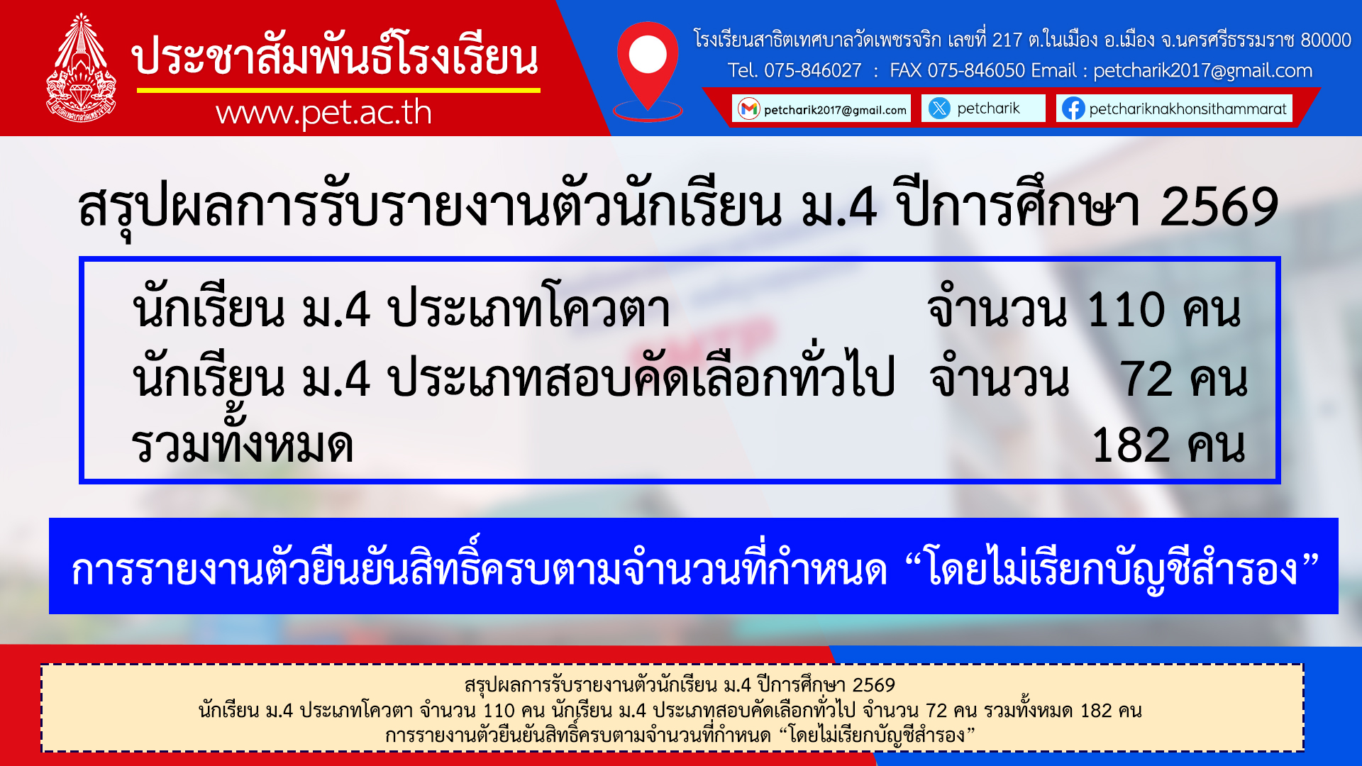22ก.พ.69 สรุปผลการรับรายงานตัวนักเรียน ม.4 ปีการศึกษา 2569