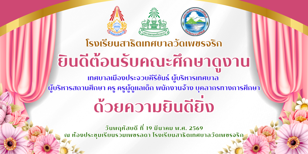 โรงเรียนสาธิตเทศบาลวัดเพชรจริก ยินดีต้อนรับคณะศึกษาดูงาน เทศบาลเมืองประจวบคีรีขันธ์ ผู้บริหารเทศบาล ผู้บริหารสถานศึกษา ครู ครูผู้ดูแลเด็ก พนักงานจ้าง บุคลากรทางการศึกษา ด้วยความยินดียิ่ง วันพฤหัสบดี ที่ 19 มีนาคม พ.ศ. 2569 ณ ห้องประชุมเรียนรวมเพขรลดา โรงเรียนสาธิตเทศบาลวัดเพชรจริก